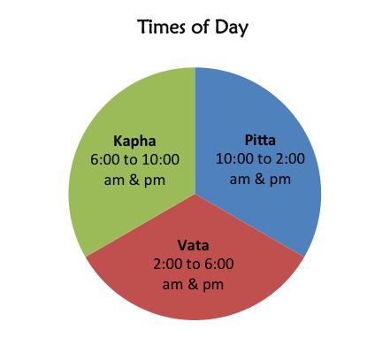 The Ayurvedic clock breaks the day into six period. It tells time in 4-hour dosha blocks. What do I mean by this? We experience each dosha twice during a 24-hour cycle. Two periods for Vata Dosha. Two time slots for Pitta Dosha. Two periods for Kapha Dosha. Basically, in a 24-hour period, we cycle through the three doshas of vata, pitta, and kapha. Each dosha becomes active at certain hours/times of the day.
