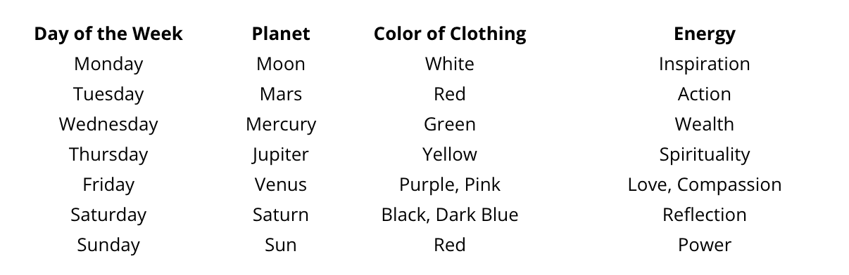 If you choose to wear the corresponding color for each planet that is represented by each day of the week, it lowers the stress around wardrobe-planning. If you can focus on a task depending on the energy of the day, it might enhance your productivity. For example, Thursdays are my days for self-study, volunteer work, and connecting with people whenever I can. My “energy” is in alignment with Jupiter’s energy.